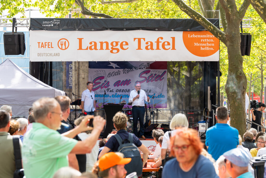 Zum Abschluss des Bundestafeltreffens haben wir die Menschen in Mannheim mitten in der Innenstadt eingeladen, an unserer Langen Tafel Platz zu nehmen und sich kostenlose Speisen und Getränke schmecken zu lassen. Trotz der Hitze kamen viele Mannheimerinnen und Mannheimer der Einladung nach und haben gemeinsam Schupfnudeln, Hochzeitssuppe mit Maultaschen und Kuchen gegessen; musikalisch untermalt von der Band „Eis am Stiel“. Die Essensausgabe übernahmen Bülent Ceylan, der damalige Mannheimer OB Dr. Peter Kurz und die Ehrenamtlichen der Tafel Mannheim.