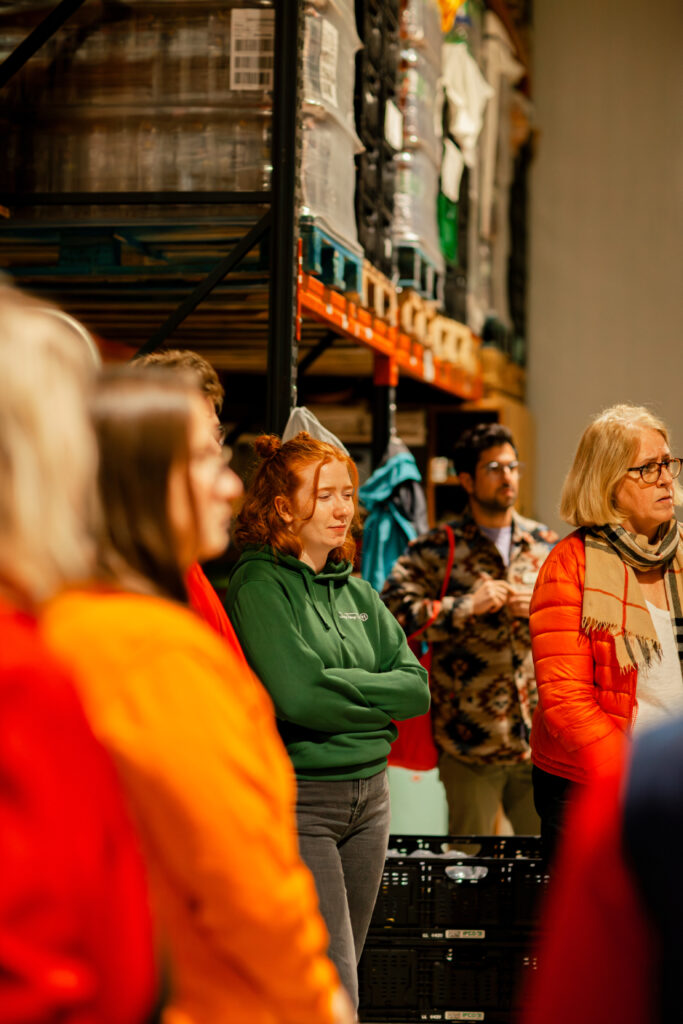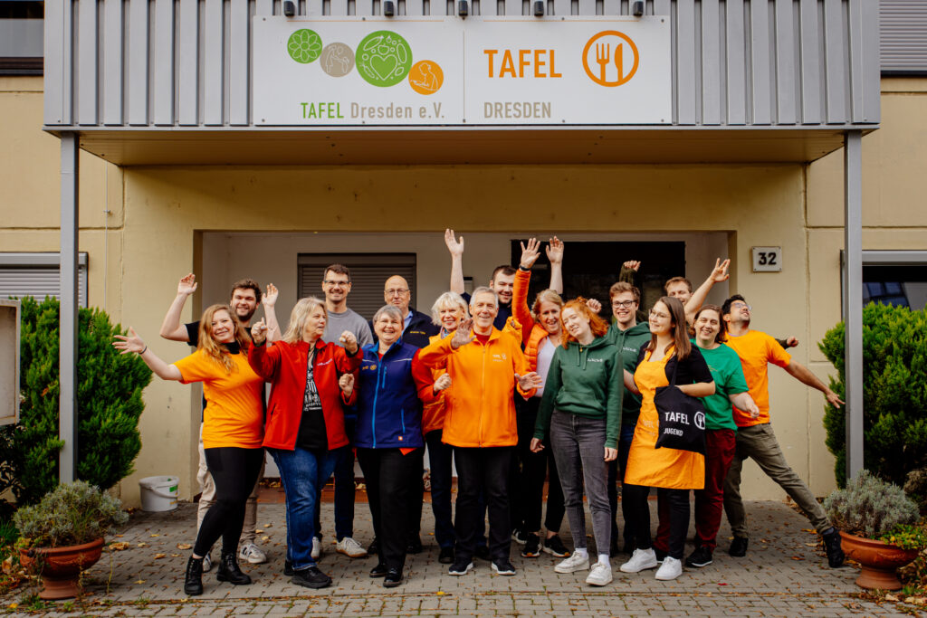 Die Teilnehmer:innen trafen sich zum Auftakt der Tafel-Tandems mit Mitarbeiter:innen der Tafel-Akademie bei der Tafel Dresden.